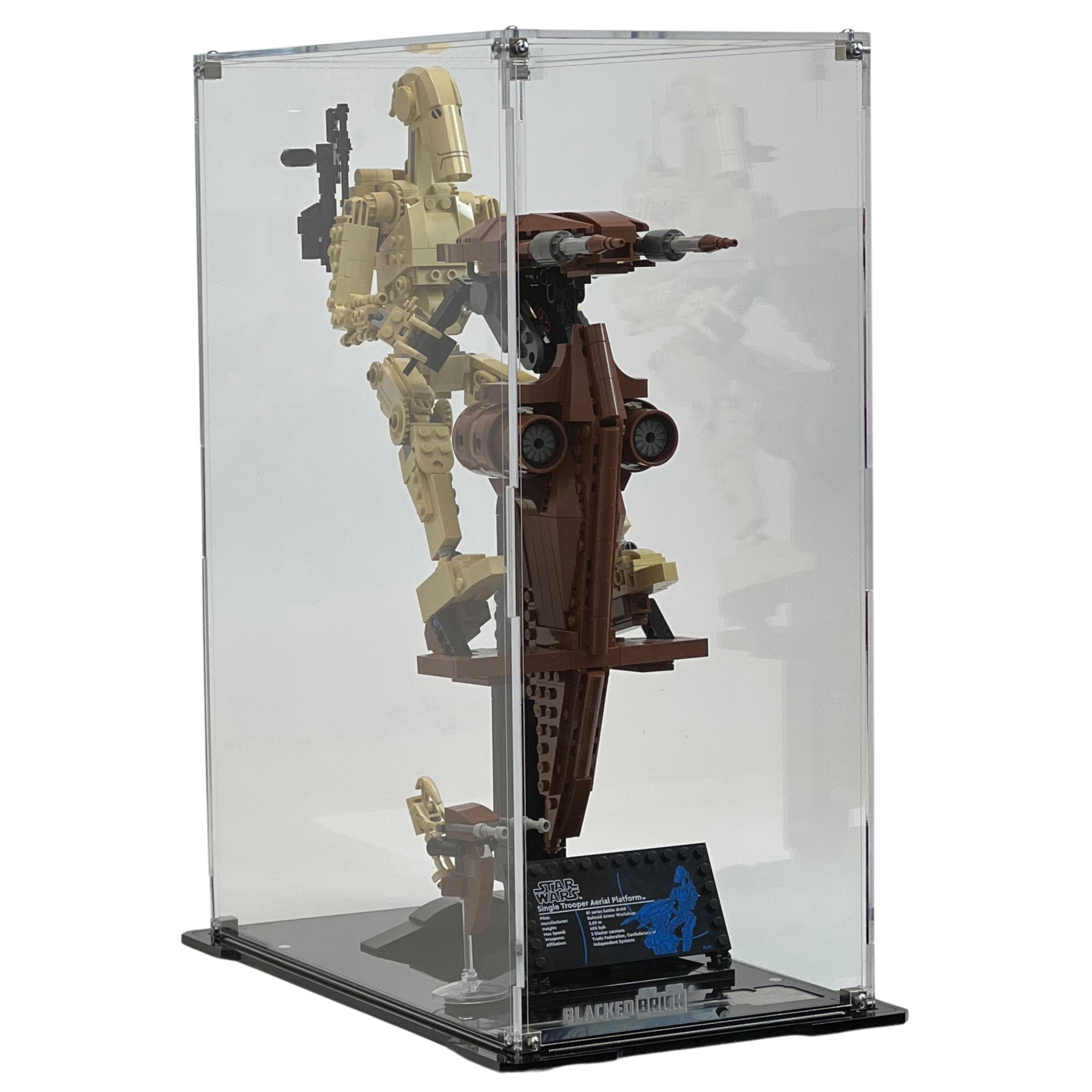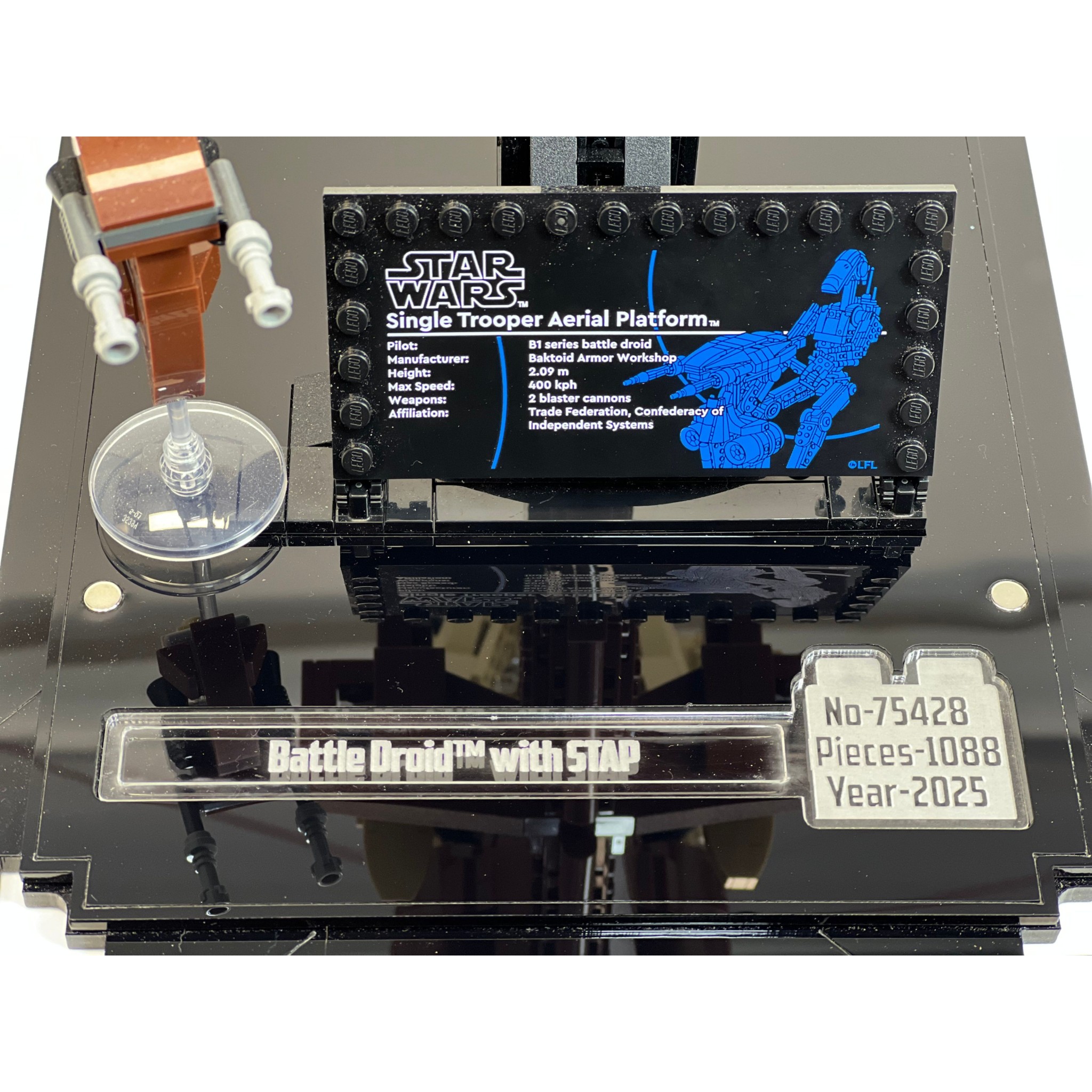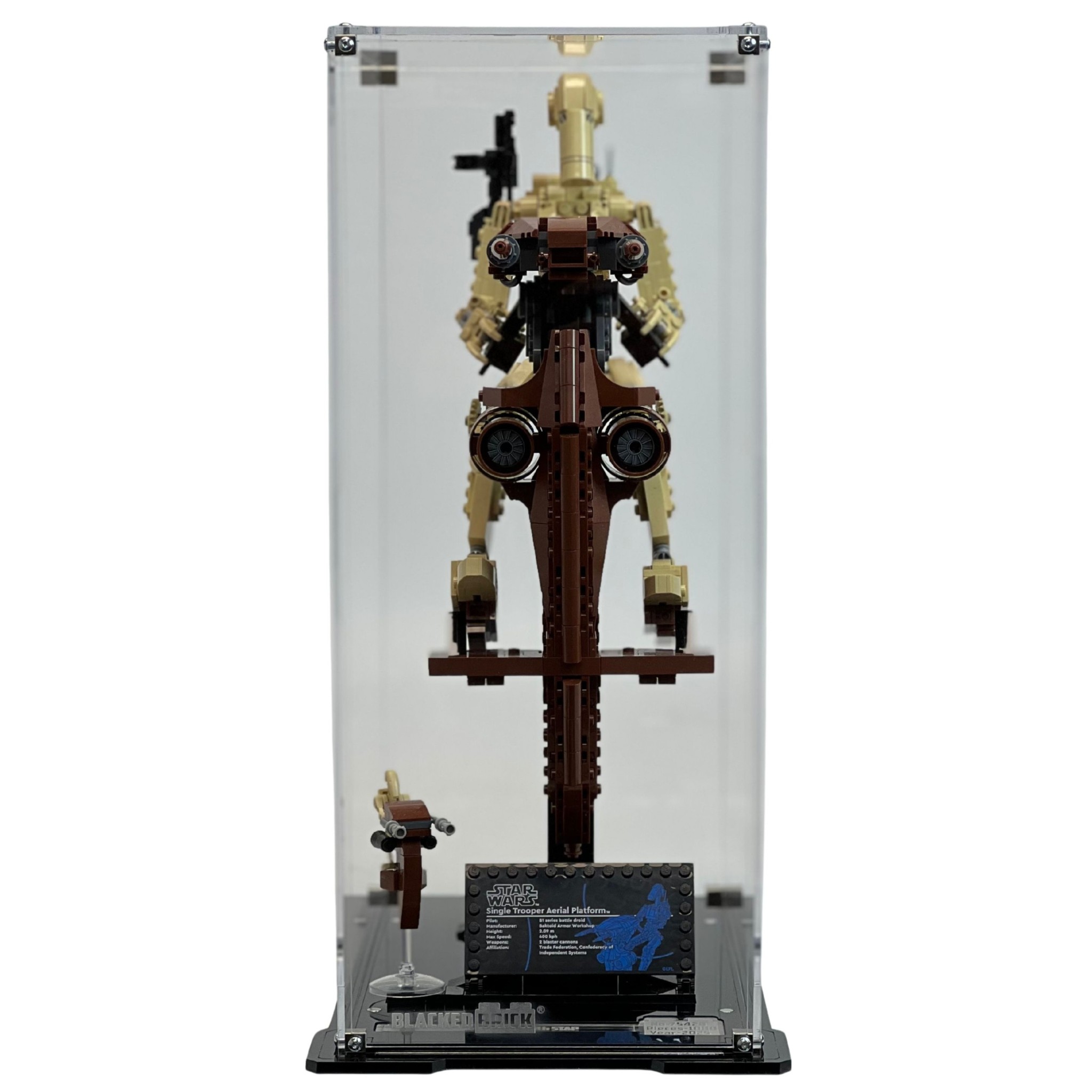 - Display case was specially designed for the (75428) LEGO® Star Wars™ Battle Droid™ with STAP.